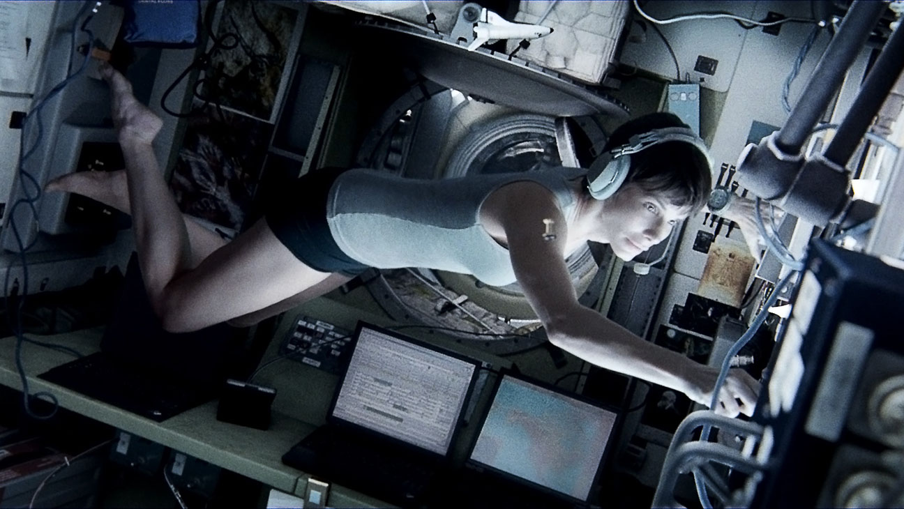 We have direct experience of gravity, as it is normally known to us, for only a few moments in the film when protagonist’s feet comes into firm contact with the ground. For the rest of the film our experience of it is indirect. We feel the effect of gravity through its absence, or to be more precise through zero gravity as it exists in outer space.